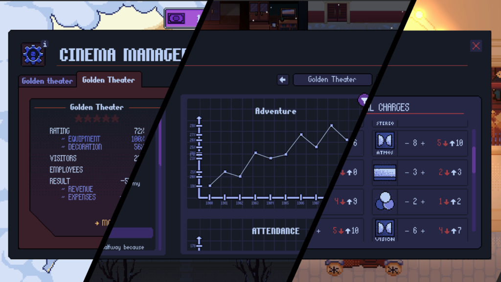 Design, expand and customize your theaters room by room: projection halls, lobbies, bars, shops, rest areas, staff rooms and more.