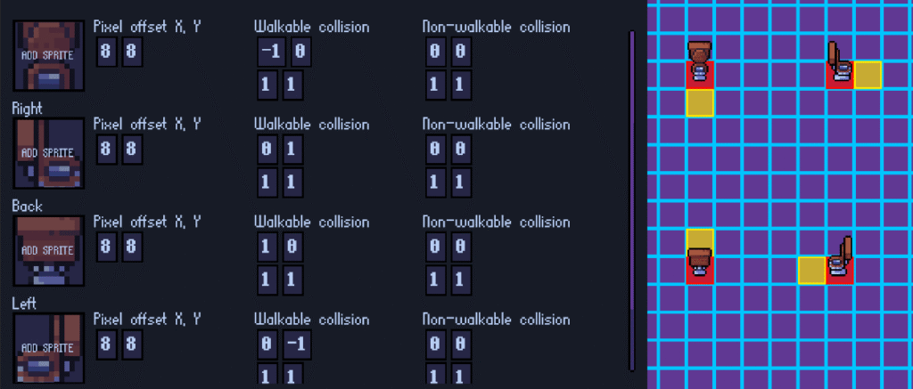 • For each sprite, you have X / Y pixel offsets to fine-tune its position on the grid so that it aligns correctly.